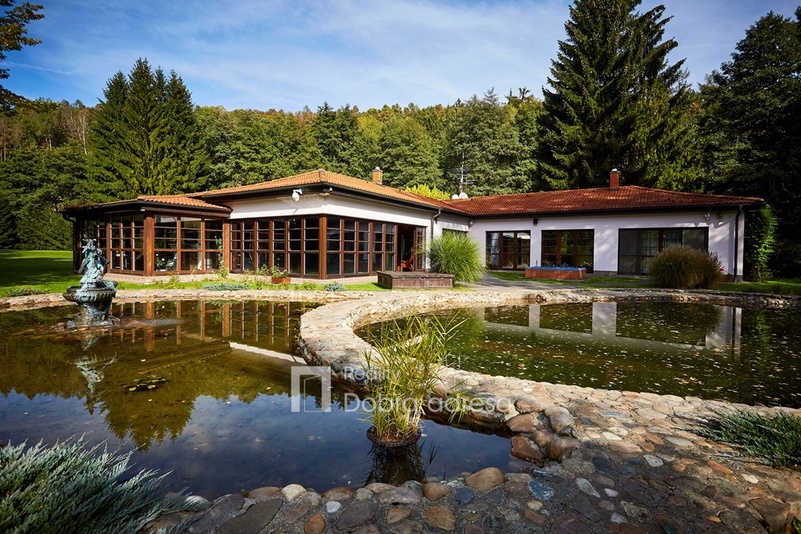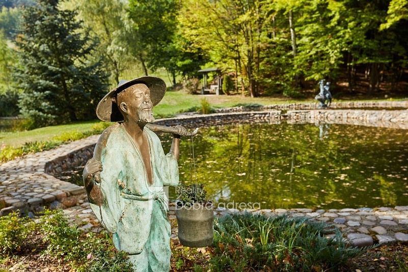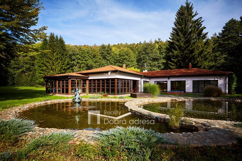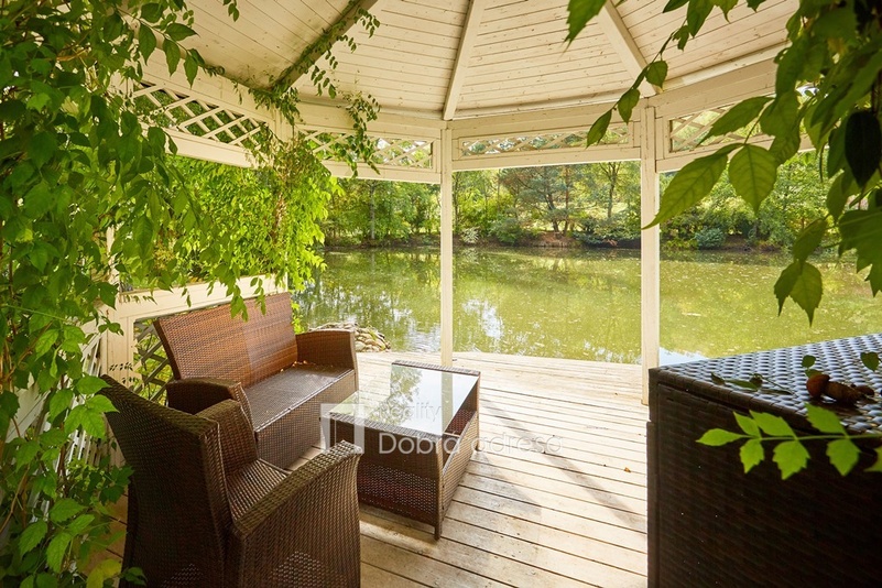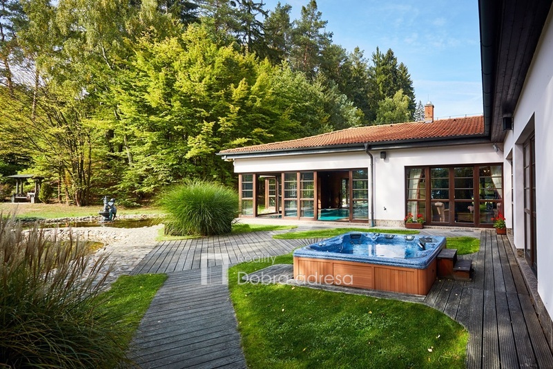 Atmosféru klidu a harmonie, která prostupuje domem můžeme cítit i v jeho okolí. Zklidnit mysl pomůže posezení na venkovní terase s výhledem na osvětlené jezírko nebo procházka po okrasné zahradě. Při dostatku času lze rybařit v menším chovném rybníku. Širší okolí domu střídají louky a les.