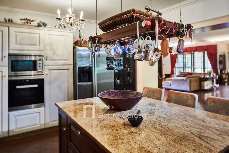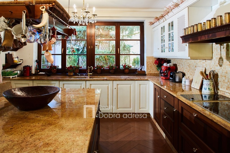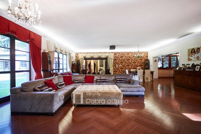 Hlavní budova o užitné ploše 579 m2 je jednopodlažní stavba s dobře uspořádaným vnitřním členěním. Dům je rozdělen do dvou křídel. V pravém, klidovém křídle domu se nachází pět z celkem šesti ložnic, dvě sdílené a jedna samostatná koupelna. V prostornějším levém křídle domu najdeme velkorysou společenskou místnost s posezením a domácím kinem, která je citlivě propojena s kuchyní a jídelnou. Privátní koupelna a průchozí šatna od obývací místnosti oddělují šestou, manželskou ložnici. Centrální části domu oddělující obě křídla dominuje prostorná hala s kulečníkovým stolem. Odtud je také přístup do technické místnosti, skladu a do stylové pracovny. Vysoký standard domu doplňují vnitřní vyhřívaný bazén s protiproudem, golfový simulátor a domácí fitness se soláriem. Součástí stavby je prostorná garáž pro dva vozy, která je propojena s domem vstupní halou. Dům je zabezpečený kamerovým a bezpečnostním systémem napojeným na pult centrální ochrany. Menší technická stavba o zastavěné ploše 160 m2 v sousedství hlavní budovy pak poskytuje bezpečné zázemí pro zahradní techniku a sněhový pluh, případně kryté parkovací stání pro vozy hostů.