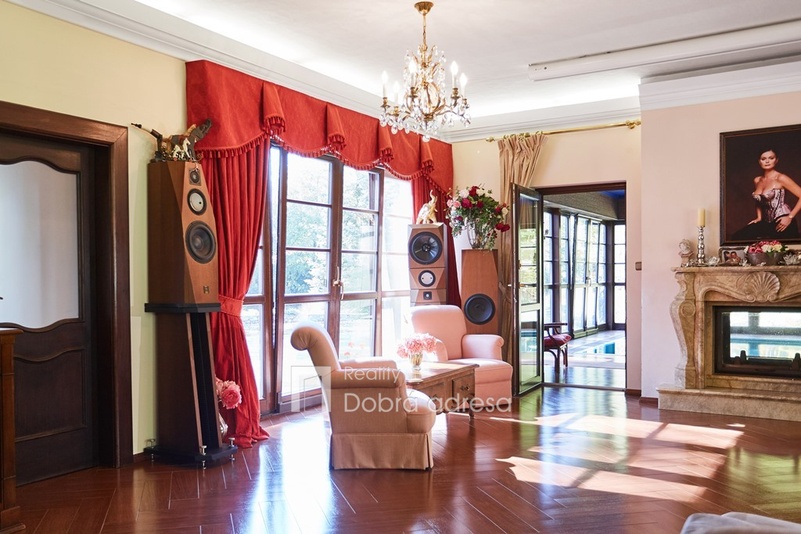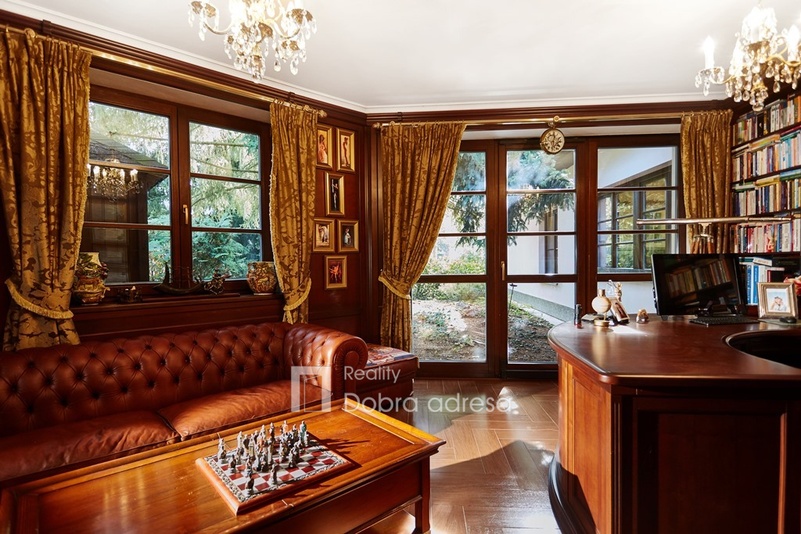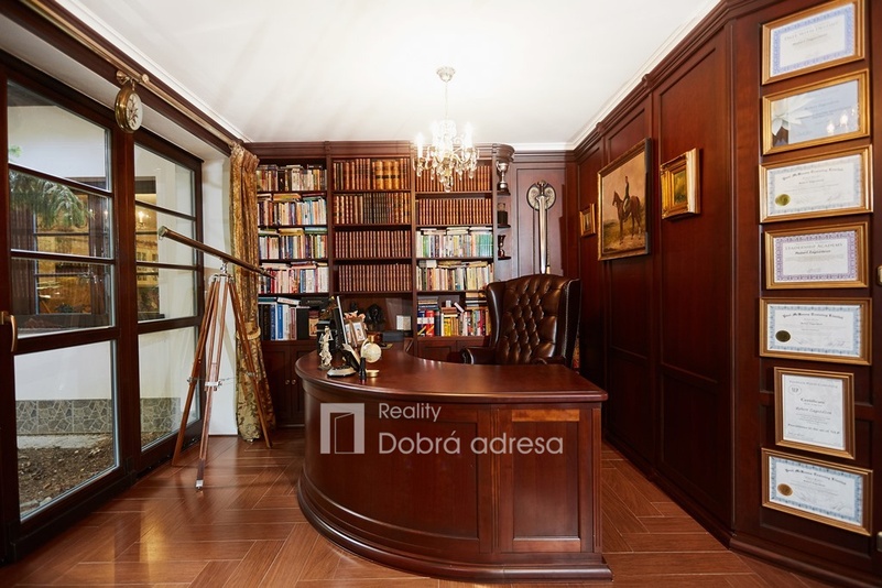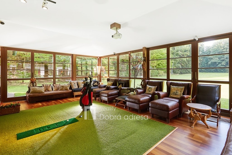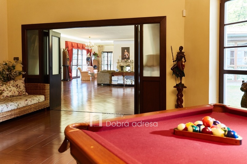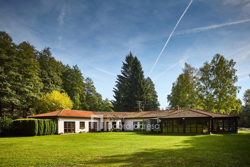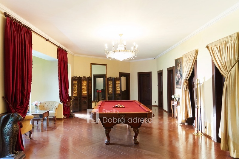 Hlavní budova o užitné ploše 579 m2 je jednopodlažní stavba s dobře uspořádaným vnitřním členěním. Dům je rozdělen do dvou křídel. V pravém, klidovém křídle domu se nachází pět z celkem šesti ložnic, dvě sdílené a jedna samostatná koupelna. V prostornějším levém křídle domu najdeme velkorysou společenskou místnost s posezením a domácím kinem, která je citlivě propojena s kuchyní a jídelnou. Privátní koupelna a průchozí šatna od obývací místnosti oddělují šestou a největší ložnici. Centrální části domu oddělující obě křídla dominuje prostorná hala s kulečníkovým stolem. Odtud je také přístup do technické místnosti, skladu a do stylové pracovny. Vysoký standard domu doplňují vnitřní vyhřívaný bazén, golfový simulátor a domácí fitness centrum se soláriem. Součástí stavby je prostorná garáž pro dva vozy, která je propojena s domem vstupní halou. Dům je zabezpečený kamerovým a bezpečnostním systémem napojeným na pult centrální ochrany. Menší technická stavba o zastavěné ploše 160 m2 v sousedství hlavní budovy pak poskytuje bezpečné zázemí pro zahradní techniku a sněhový pluh, případně kryté parkovací stání pro vozy hostů.