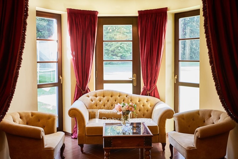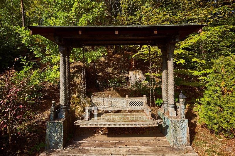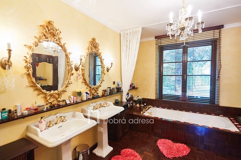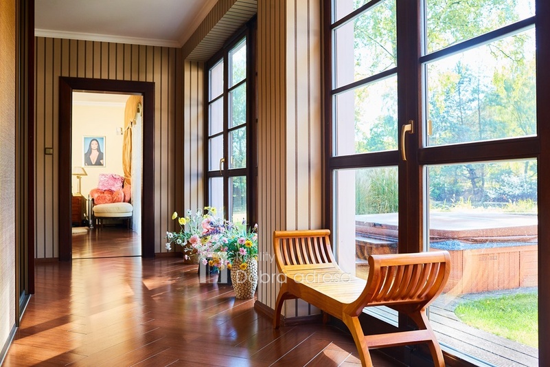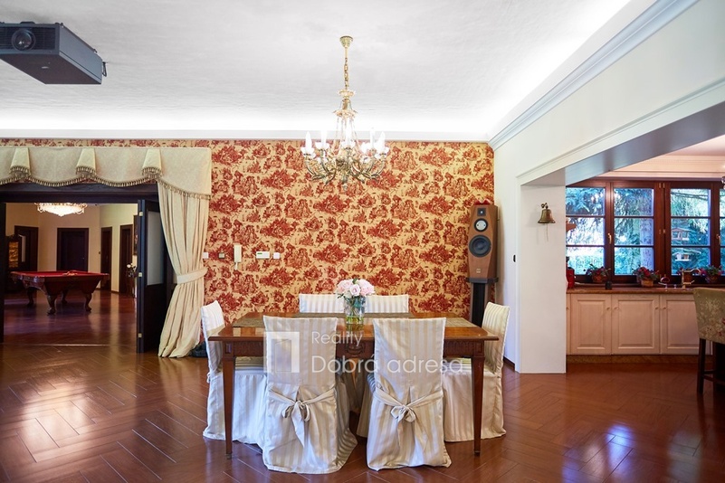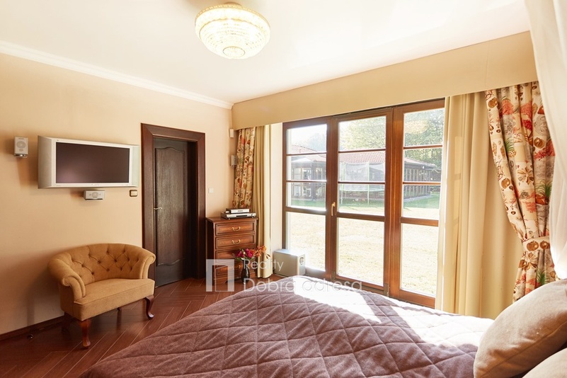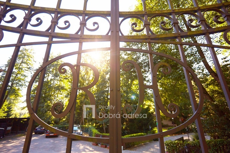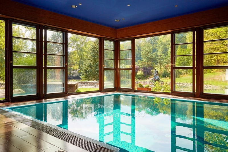 Hlavní budova o užitné ploše 579 m2 je jednopodlažní stavba s dobře uspořádaným vnitřním členěním. Dům je rozdělen do dvou křídel. V pravém, klidovém křídle domu se nachází pět z celkem šesti ložnic, dvě sdílené a jedna samostatná koupelna. V prostornějším levém křídle domu najdeme velkorysou společenskou místnost s posezením a domácím kinem, která je citlivě propojena s kuchyní a jídelnou. Privátní koupelna a průchozí šatna od obývací místnosti oddělují šestou a největší ložnici. Centrální části domu oddělující obě křídla dominuje prostorná hala s kulečníkovým stolem. Odtud je také přístup do technické místnosti, skladu a do stylové pracovny. Vysoký standard domu doplňují vnitřní vyhřívaný bazén, golfový simulátor a domácí fitness centrum se soláriem. Součástí stavby je prostorná garáž pro dva vozy, která je propojena s domem vstupní halou. Dům je zabezpečený kamerovým a bezpečnostním systémem napojeným na pult centrální ochrany. Menší technická stavba o zastavěné ploše 160 m2 v sousedství hlavní budovy pak poskytuje bezpečné zázemí pro zahradní techniku a sněhový pluh, případně kryté parkovací stání pro vozy hostů.